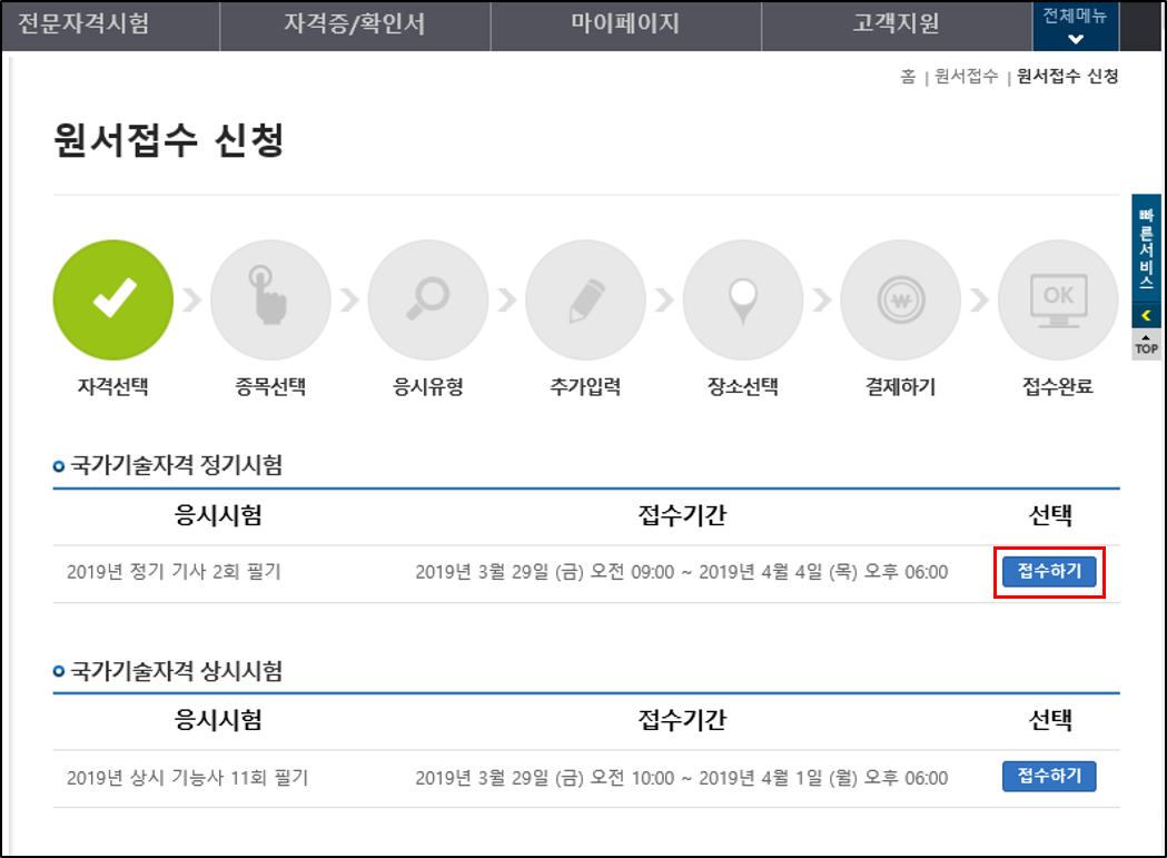 정보처리기사를 선택 후 [접수하기] 버튼을 클릭. 왜 정기라고 축약하는 지는 모르겠음.